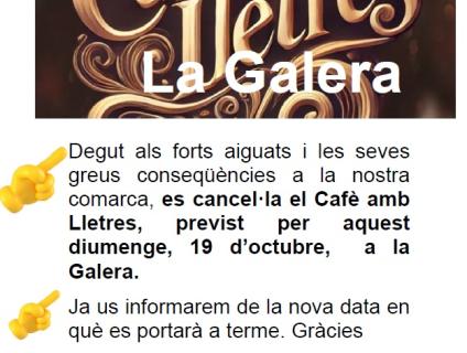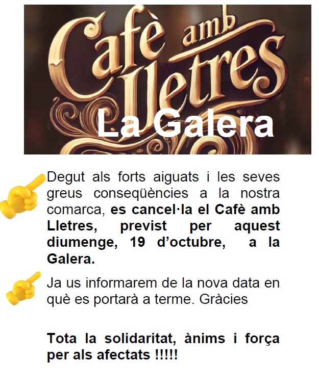 A la Galera, HAVIA DE TENIR LLOC, el 19 d'octubre, al Museu Terracota (Llibre: Caldrà la pluja de Carme Cruelles) PERÒ DEGUT ALS FORTS AIGUATS I LES SEVES CONSEQÜÈNCIES, A LA NOSTRA COMARCA, ES CANCEL·LA